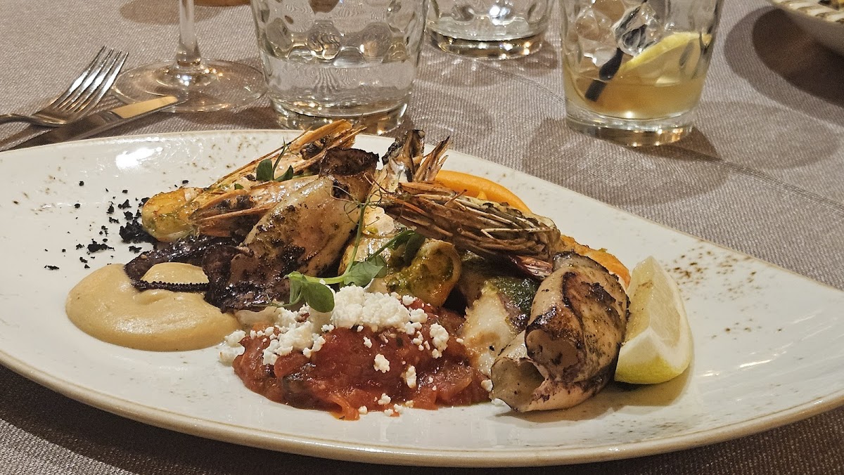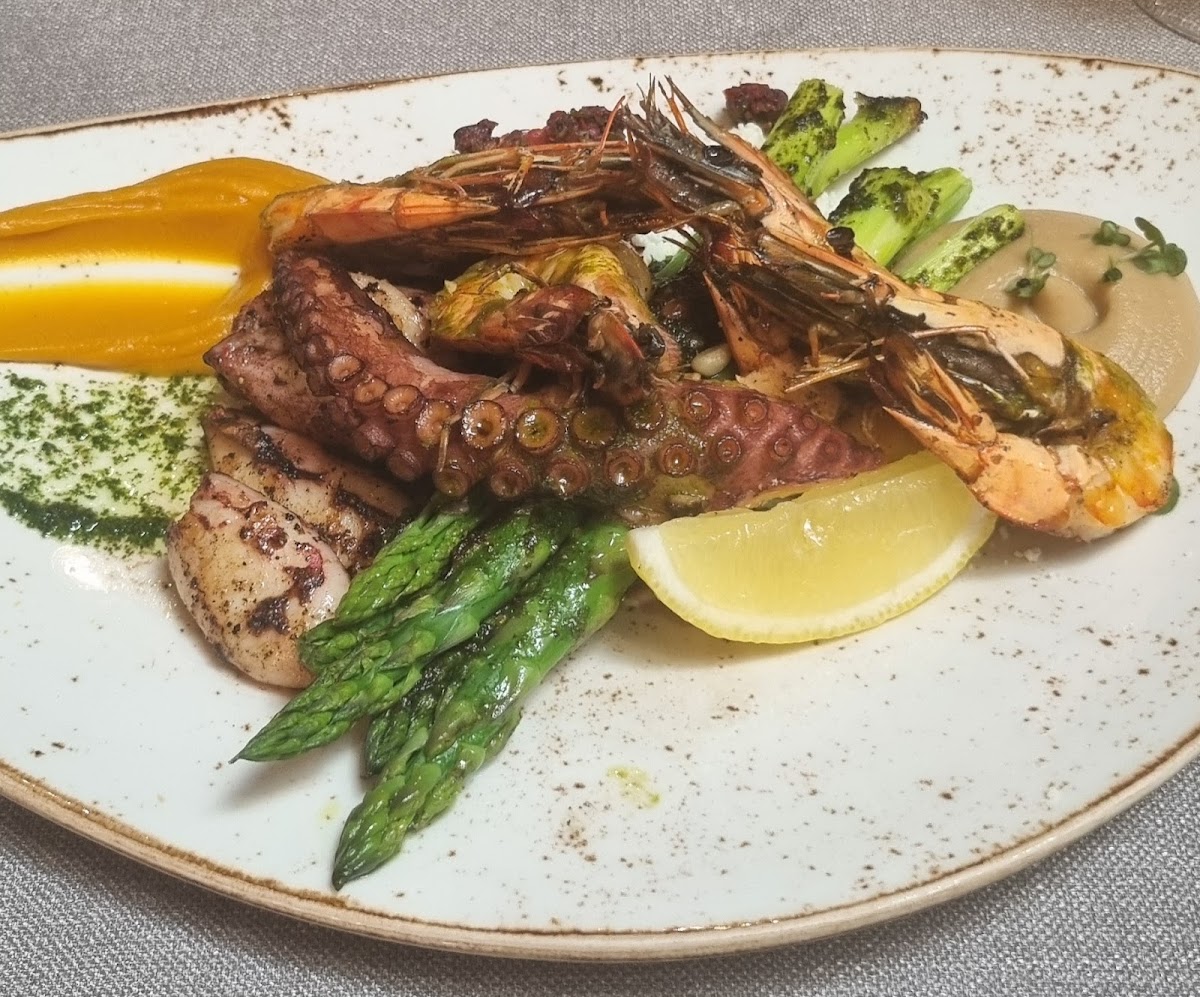 We had the Seabass carpaccio, tomato soup, rocket salad, and seafood mixed grill. All the food was beautifully prepared and tasted fantastic. Arville, the waiter, was outstanding and took great care of us. Would love to come back here in the future!